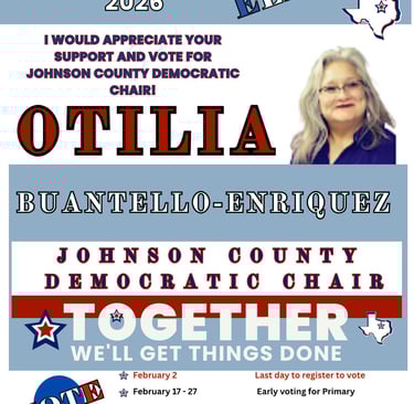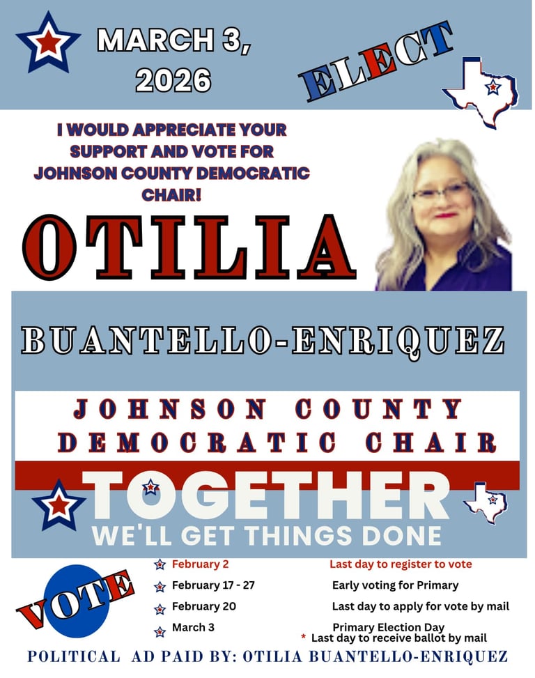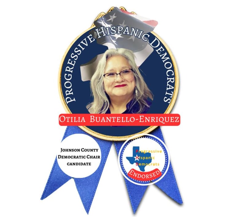 Otilia is fairly new to the political landscape but she has trained and applied all her training to become well informed of how Texas politics affects her and her community. Otilia Buantello-Enriquez is married and currently resides in Burleson, Johnson County and is a member of the Texas Silver-Haired Legislature. The Texas Silver-Haired Legislature strives to promote good government for all Texans by directly involving Senior citizens in the legislative process. Her role is to write resolutions concerning senior issues. She is currently active with the PHDs and the Official Texas Hispanic Caucus of the TX DP. She is a candidate for the Johnson County Party Chair.
